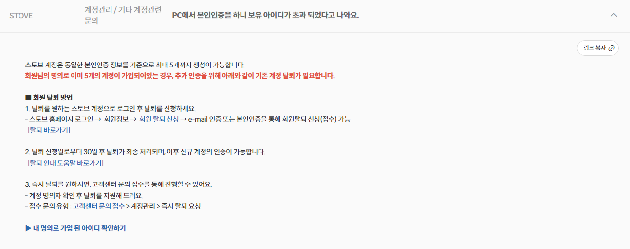 스토브 즉시 탈퇴 공식 문의 답변